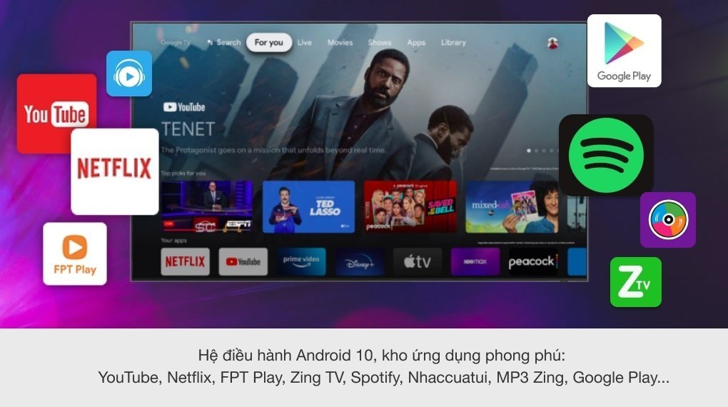 Kho ứng dụng sẵn có trên tivi đa dạng như: YouTube, Google Play, Netflix, Trình duyệt web. Ngoài ra tùy theo nhu cầu và sở thích mà bạn có thể tải thêm nhiều ứng dụng khác như: Spotify, VTVCab ON, FPT Play,...