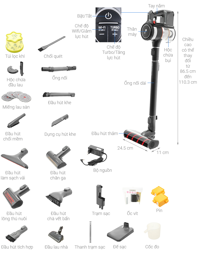 + Đầu lau sàn: Giảm thời gian dọn dẹp của bạn bằng cách hút bụi và lau nhà cùng một lúc.