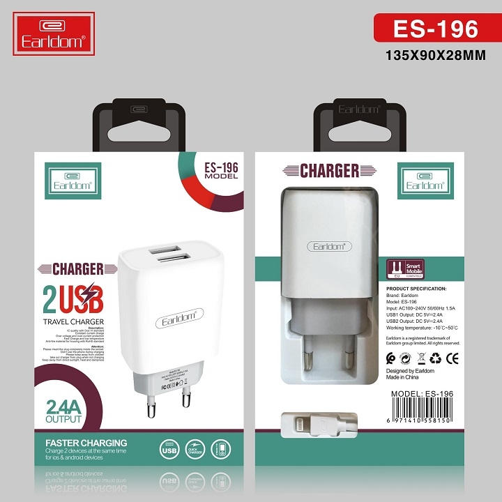 Sạc Bộ Earldom ES - 196C (Hỗ Trợ 2 Cổng USB)