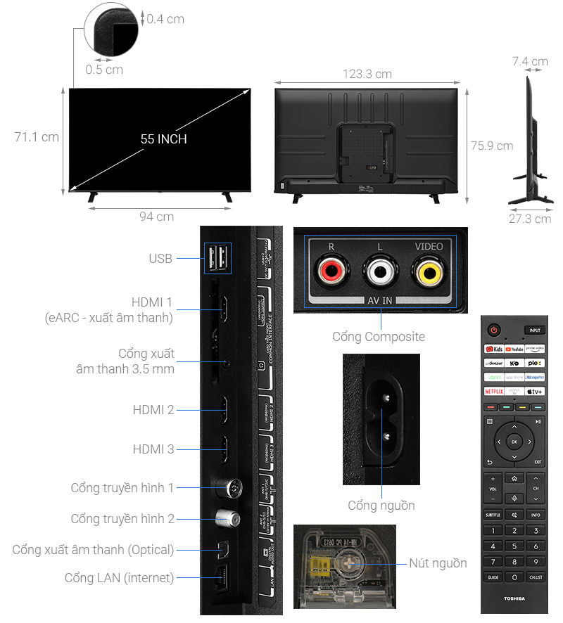 3 cổng HDMI có 1 cổng HDMI eARC (ARC), 1 cổng Composite