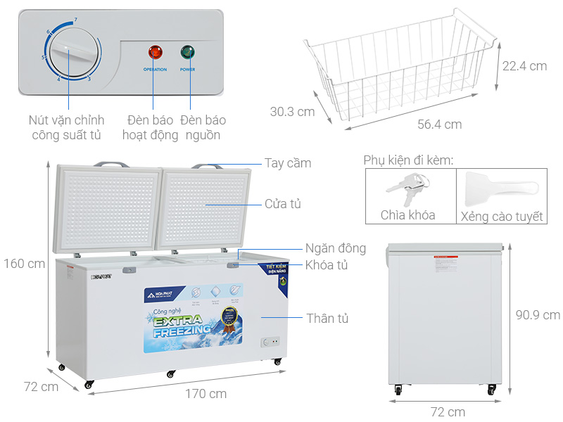 Nút điều chỉnh nhiệt độ bên ngoài tủKhoá cửa tủXẻng cạo tuyếtGiỏ đựng đồLỗ thoát nướcBánh xe